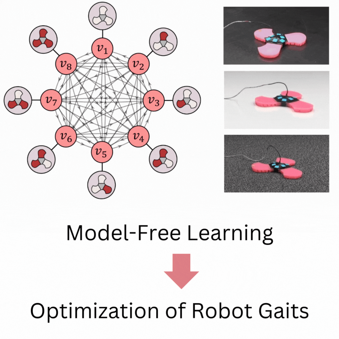 How do we know what control inputs to use to get a robot to successfully move around in a given environment? For traditional rigid robots, we use established kinematics and dynamics equations to apply model-based control. But this isn’t so simple for soft robots, whose sensivity to manufacturing innacuries and environmental forces alongisde complicated dynamics hinder the feasibility and accuracy of traditional approaches. Instead, we can use a reinforcement learning-based approach, where we collect data on repeated robot motions which are then fed into an optimization algorithm. The result is optimal translation and rotation gaits that are found without using an explicit model of the robot. We can even use these gaits to achieve real-time path planning with obstacle avoidance.